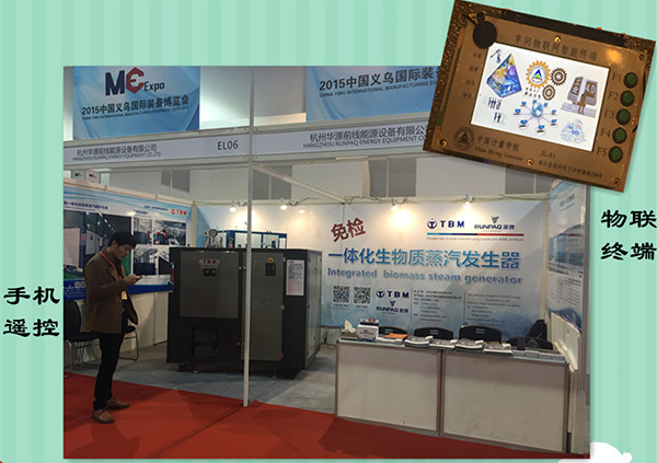 2015年11月30日到12月3日,免檢型一體化生物質蒸汽發(fā)生器亮相義烏國際裝備博覽會,和著互聯網+契機,突出智能化成果,我們的參展產品除了自動化程度高、安裝簡單、環(huán)保排放等優(yōu)點,還引入了物聯網概念,借助平臺終端和手機APP程序,可以實現對蒸汽發(fā)生器的手機遠程遙控。