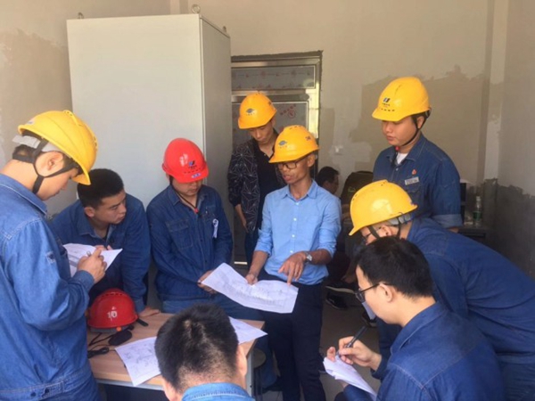 (圖中身著藍色襯衣的工程中心經(jīng)理溫先文,正向鍋爐專工介紹定期維護方案)