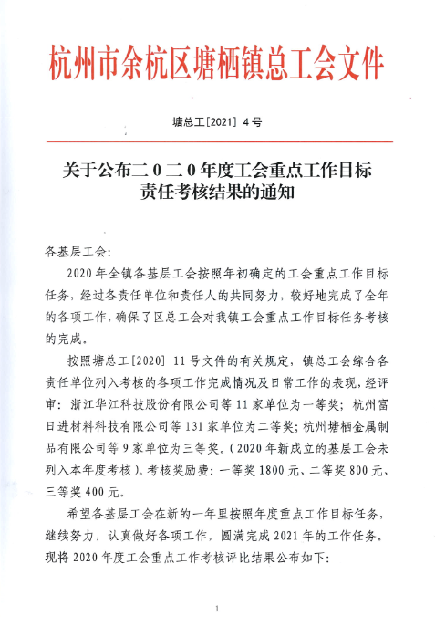 年度工會重點工作目標(biāo)責(zé)任考核中獲得一等獎,這是我司工會在該項考核中首次獲得一等獎。在