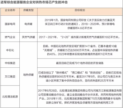 同時,“煤改氣”和“煤改電”政策的推行對供熱企業(yè)帶來了強烈沖擊。截至目前,進軍綜合能源服務(wù)的電力及燃氣等企業(yè)對供熱企業(yè)的沖擊已經(jīng)開始顯現(xiàn),具體見表2。