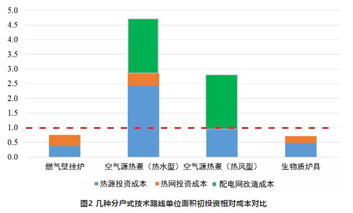 分散供暖方式中,燃?xì)獗趻鞝t、戶用生物質(zhì)爐具單位面積投資成本較低,是燃煤鍋爐的0.7~0.8倍;熱泵供暖主要包括空氣源熱泵、地源熱泵等,這里以空氣源熱泵為例分析,不考慮配電網(wǎng)改造成本時(shí),分戶式空氣源熱泵(熱風(fēng)型)單位面積投資成本略低于燃煤鍋爐,分戶式空氣源熱泵(熱水型)投資成本較高,考慮配電網(wǎng)改造成本后,分戶式熱泵投資成本均比較高。分戶式電供暖的配電網(wǎng)改造成本要明顯高于集中式電供暖的配電網(wǎng)改造成本。