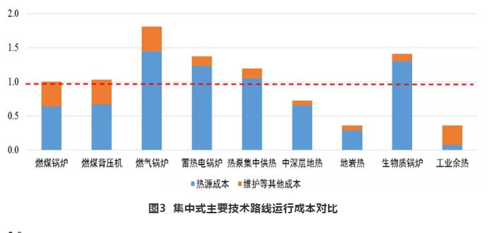 初投資成本方面,集中供暖方式中,燃?xì)忮仩t單位面積初投資低于燃煤鍋爐,生物質(zhì)鍋爐、工業(yè)余熱單位面積初投資與燃煤鍋爐相當(dāng),燃煤背壓機(jī)與中深層地?zé)釂挝幻娣e初投資是燃煤鍋爐的1.5~2.0倍,集中式電供暖投資成本最高,是燃煤鍋爐的3.5~5倍,主要是供熱系統(tǒng)造價(jià)比較貴,配電網(wǎng)改造成本在總成本中占比約為15%~20%;地巖熱單位面積投資成本高于中深層地?zé)幔侨济哄仩t的2.5~3.0倍。
