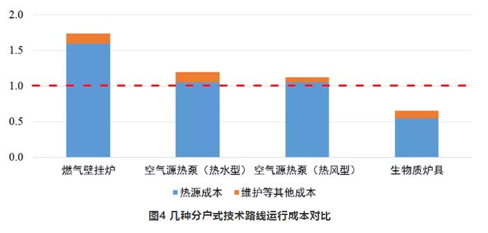 分散供暖方式中,分戶式生物質(zhì)供暖運(yùn)行成本最低,僅是燃煤鍋爐的0.7倍,熱泵供暖與燃煤鍋爐相當(dāng),壁掛爐供暖運(yùn)行成本是燃煤鍋爐的1.5~2.0倍。